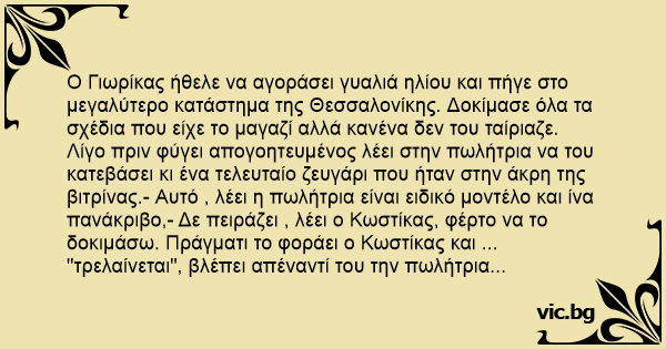 Ο Γιωρίκας ήθελε να αγοράσει γυαλιά ηλίου και πήγε στο μεγαλύτερο κατάστημα της Θεσσαλονίκης. Δοκίμασε όλα τα σχέδια που είχε το μαγαζί αλλά κανένα δεν του ταίριαζε. Λίγο πριν φύγει απογοητευμένος λέει στην πωλήτρια να του κατεβάσει κι ένα τελευταίο ζευγάρι που ήταν στην άκρη της βιτρίνας.- Αυτό , λέει η πωλήτρια είναι ειδικό μοντέλο και ίνα πανάκριβο,- Δε πειράζει , λέει ο Κωστίκας, φέρτο να το δοκιμάσω. Πράγματι το φοράει ο Κωστίκας και ... "τρελαίνεται", βλέπει απέναντί του την πωλήτρια ... γυμνή! βγάζει τα γυαλιά βλέπει με ρούχα την πωλήτρια , τα ξαναφοράει πάλι γυμνή!- Αυτά θα πάρω λέει, όσο κι αν πληρώσω.- Αυτά κύριε, κάνουν 500.000 λέει η πωλήτρια.- Δεν πειράζει κοπέλα μου , λέει ο Κωστίκας, δώστα γρήγορα , γιατί βιάζομαι να πιω ένα καφέ στην Αριστοτέλους! Παίρνει τα γυαλιά , τα φοράει και ξεκινάει για βόλτα, μια φορώντας μια βγάζοντας και απολαμβάνει το ... Θέαμα. Κάθεται για καφέ σε καφετέρια με πολύ "περατζάδα" και την έχει βρει. Τηλεφωνεί στη Σουμέλα για να της πει ότι κάτι του ... έτυχε και δεν θα πάει το μεσημέρι στο σπίτι. Πέρασαν αρκετές ώρες κι ο Κωστίκας άρχισε να βαριέται. Αποφάσισε τελικά να πάει σπίτι να κάνει και έκπληξη στη Σουμέλα. Μπαίνοντας στο σπίτι , φοράει τα γυαλιά αλλά ... σοκάρεται με αυτό που βλέπει!Βλέπει στον καναπέ τη Σουμέλα και τον κουμπάρο γυμνούς και αγκαλιά!Βγάζει τα γυαλιά... πάλι γυμνοί . τα ξαναφοράει πάλι γυμνοί... Βγαίνει έξω από το σπίτι και γεμάτος απογοήτευση λέει: