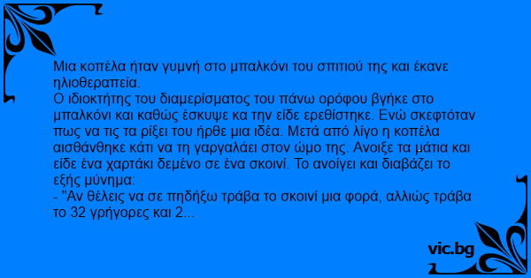 Ο ιδιοκτήτης του διαμερίσματος του πάνω ορόφου βγήκε στο μπαλκόνι και καθώς έσκυψε κα την είδε ερεθίστηκε. Ενώ σκεφτόταν πως να τις τα ρίξει του ήρθε μια ιδέα. Μετά από λίγο η κοπέλα αισθάνθηκε κάτι να τη γαργαλάει στον ώμο της. Ανοιξε τα μάτια και είδε ένα χαρτάκι δεμένο σε ένα σκοινί. Το ανοίγει και διαβάζει το εξής μύνημα: