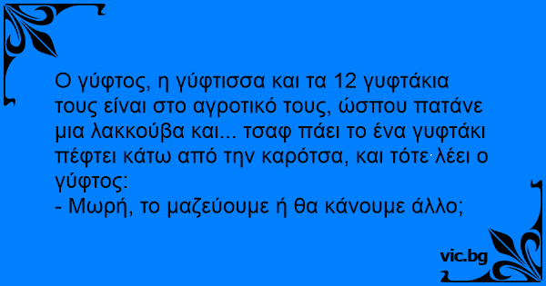 Ο γύφτος, η γύφτισσα και τα 12 γυφτάκια τους είναι στο αγροτικό τους, ώσπου πατάνε μια λακκούβα και... τσαφ πάει το ένα γυφτάκι πέφτει κάτω από την καρότσα, και τότε λέει ο γύφτος: