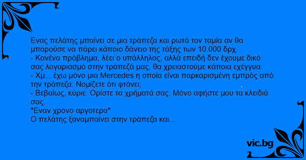 - Κανένα πρόβλημα, λέει ο υπάλληλος, αλλά επειδή δεν έχουμε δικό σας λογαριασμό στην τράπεζά μας, θα χρειαστούμε κάποια εχέγγυα.