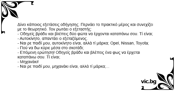 Δίνει κάποιος εξετάσεις οδήγησης. Περνάει το πρακτικό μέρος και συνεχίζει με το θεωρητικό. Τον ρωτάει ο εξεταστής: