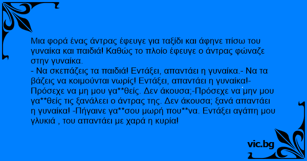 Μια φορά ένας άντρας έφευγε για ταξίδι και άφηνε πίσω του γυναίκα και παιδιά! Καθώς το πλοίο έφευγε ο άντρας φώναζε στην γυναίκα.