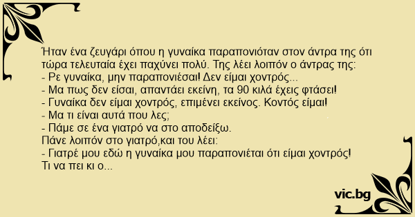 Ήταν ένα ζευγάρι όπου η γυναίκα παραπονιόταν στον άντρα της ότι τώρα τελευταία έχει παχύνει πολύ. Της λέει λοιπόν ο άντρας της: