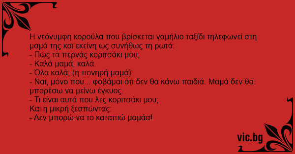 Η νεόνυμφη κορούλα που βρίσκεται γαμήλιο ταξίδι τηλεφωνεί στη μαμά της και εκείνη ως συνήθως τη ρωτά: