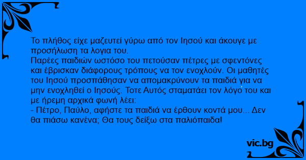 - Πέτρο, Παύλο, αφήστε τα παιδιά να έρθουν κοντά μου... Δεν θα πιάσω κανένα; Θα τους δείξω στα παλιόπαιδα!