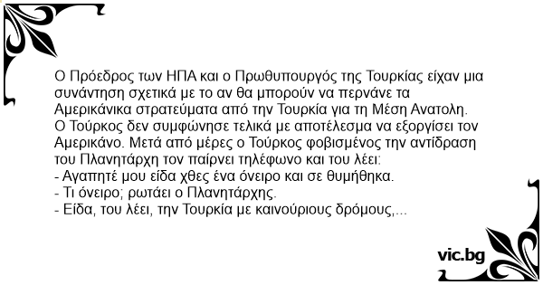 - Είδα, του λέει, την Τουρκία με καινούριους δρόμους, πλατείες, αεροδρόμια, λιμάνια, κτίρια και στην ταράτσα κάθε κτιρίου υπήρχε ένα πανό που έγραφε για την Αμερικανοτουρκική φιλία!