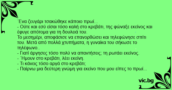 Un tip si sotia lui se cearta De zor la micul dejun: - Si daca vrei sa Stii, nici nu esti foarte bun la pat! ii spune ea si Pleaca la lucru trantind usa. Pe la amiaza Incepe sa-i para rau si suna...