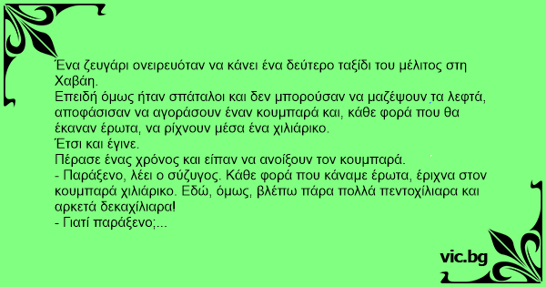 Επειδή όμως ήταν σπάταλοι και δεν μπορούσαν να μαζέψουν τα λεφτά, αποφάσισαν να αγοράσουν έναν κουμπαρά και, κάθε φορά που θα έκαναν έρωτα, να ρίχνουν μέσα ένα χιλιάρικο.