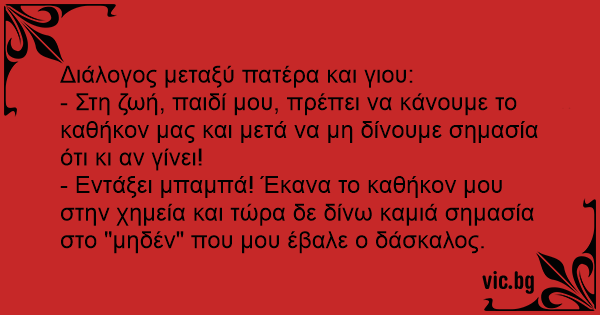 - Εντάξει μπαμπά! Έκανα το καθήκον μου στην χημεία και τώρα δε δίνω καμιά σημασία στο "μηδέν" που μου έβαλε ο δάσκαλος.