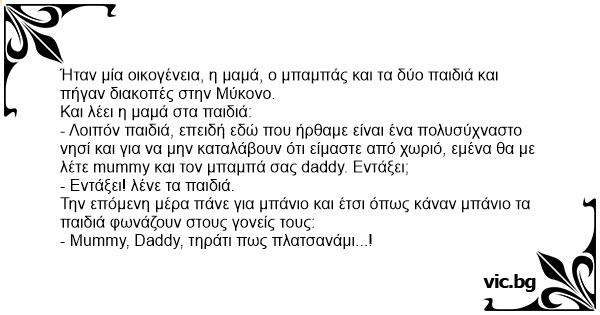 - Λοιπόν παιδιά, επειδή εδώ που ήρθαμε είναι ένα πολυσύχναστο νησί και για να μην καταλάβουν ότι είμαστε από χωριό, εμένα θα με λέτε mummy και τον μπαμπά σας daddy. Εντάξει;