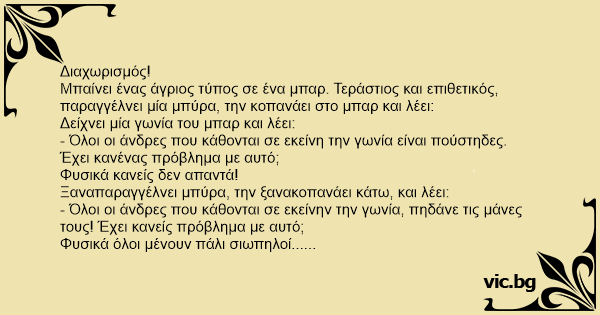 Μπαίνει ένας άγριος τύπος σε ένα μπαρ. Τεράστιος και επιθετικός, παραγγέλνει μία μπύρα, την κοπανάει στο μπαρ και λέει: