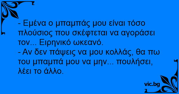 - Εμένα ο μπαμπάς μου είναι τόσο πλούσιος που σκέφτεται να αγοράσει τον... Ειρηνικό ωκεανό.