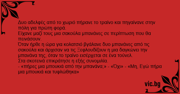 - «πήρες μια μπουκιά από την μπανάνα;» - «Όχι» - «Μη, Εγώ πήρα μια μπουκιά και τυφλώθηκα»