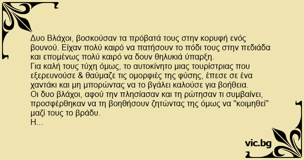 Δυο Βλάχοι, βοσκούσαν τα πρόβατά τους στην κορυφή ενός βουνού. Είχαν πολύ καιρό να πατήσουν το πόδι τους στην πεδιάδα και επομένως πολύ καιρό να δουν θηλυκιά ύπαρξη.