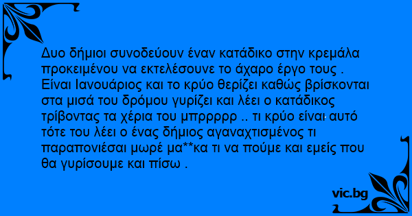 Δυο δήμιοι συνοδεύουν έναν κατάδικο στην κρεμάλα προκειμένου να εκτελέσουνε το άχαρο έργο τους . Είναι Ιανουάριος και το κρύο θερίζει καθώς βρίσκονται στα μισά του δρόμου γυρίζει και λέει ο κατάδικος τρίβοντας τα χέρια του μπρρρρρ .. τι κρύο είναι αυτό τότε του λέει ο ένας δήμιος αγαναχτισμένος τι παραπονιέσαι μωρέ μα**κα τι να πούμε και εμείς που θα γυρίσουμε και πίσω .