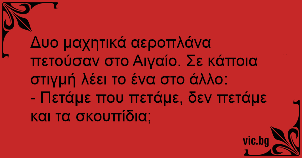 Δυο μαχητικά αεροπλάνα πετούσαν στο Αιγαίο. Σε κάποια στιγμή λέει το ένα στο άλλο: