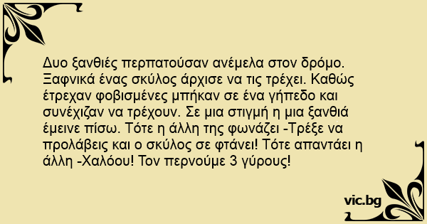 Δυο ξανθιές περπατούσαν ανέμελα στον δρόμο. Ξαφνικά ένας σκύλος άρχισε να τις τρέχει. Καθώς έτρεχαν φοβισμένες μπήκαν σε ένα γήπεδο και συνέχιζαν να τρέχουν. Σε μια στιγμή η μια ξανθιά έμεινε πίσω. Τότε η άλλη της φωνάζει -Τρέξε να προλάβεις και ο σκύλος σε φτάνει! Τότε απαντάει η άλλη -Χαλόου! Τον περνούμε 3 γύρους!