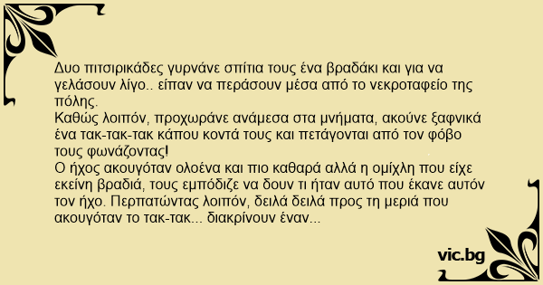 Καθώς λοιπόν, προχωράνε ανάμεσα στα μνήματα, ακούνε ξαφνικά ένα τακ-τακ-τακ κάπου κοντά τους και πετάγονται από τον φόβο τους φωνάζοντας!