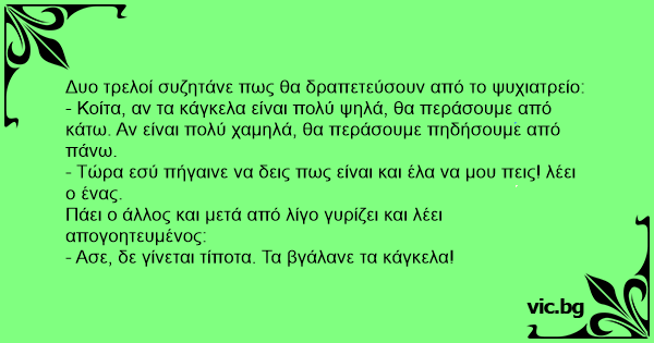 Δυο τρελοί συζητάνε πως θα δραπετεύσουν από το ψυχιατρείο: - Κοίτα, αν τα κάγκελα είναι πολύ ψηλά, θα περάσουμε από κάτω. Αν είναι πολύ χαμηλά, θα περάσουμε πηδήσουμε από πάνω. - Τώρα εσύ πήγαινε να δεις πως είναι και έλα να μου πεις! λέει ο ένας. Πάει ο άλλος και μετά από λίγο γυρίζει και λέει απογοητευμένος: - Aσε, δε γίνεται τίποτα. Τα βγάλανε τα κάγκελα!