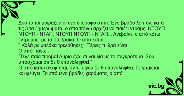 , σκέφτεται ο τύπος, και κατεβαίνει κάτω να δει αν ο άλλος είναι εντάξει. Κοιτάει στο υπνοδωμάτιο, το κρεβάτι άστρωτο, ο τύπος πουθενά. Κοιτάει στην κουζίνα, τίποτα. Κοιτάει στο σαλόνι, τίποτα. Βλέπει φως στο μπάνιο, πλησιάζει, ανοίγει την πόρτα και βλέπει τον από κάτω να τραβάει μαλακία. Ο από πάνω :