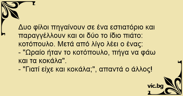 Δυο φίλοι πηγαίνουν σε ένα εστιατόριο και παραγγέλλουν και οι δύο το ίδιο πιάτο: κοτόπουλο. Μετά από λίγο λέει ο ένας: