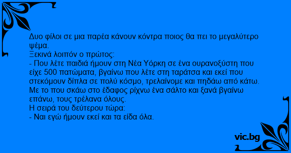 Δυο φίλοι σε μια παρέα κάνουν κόντρα ποιος θα πει το μεγαλύτερο ψέμα.