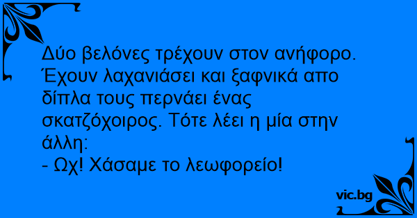 Δύο βελόνες τρέχουν στον ανήφορο. Έχουν λαχανιάσει και ξαφνικά απο δίπλα τους περνάει ένας σκατζόχοιρος. Τότε λέει η μία στην άλλη: