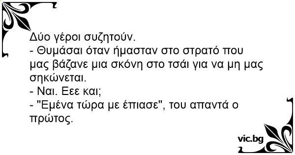 - Θυμάσαι όταν ήμασταν στο στρατό που μας βάζανε μια σκόνη στο τσάι για να μη μας σηκώνεται.