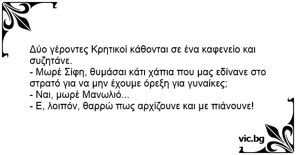 Δύο γέροντες Κρητικοί κάθονται σε ένα καφενείο και συζητάνε.
