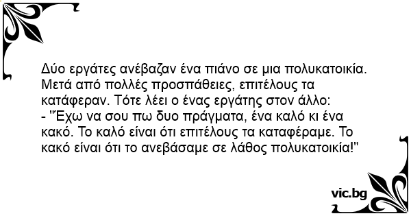 - "Έχω να σου πω δυο πράγματα, ένα καλό κι ένα κακό. Το καλό είναι ότι επιτέλους τα καταφέραμε. Το κακό είναι ότι το ανεβάσαμε σε λάθος πολυκατοικία!"