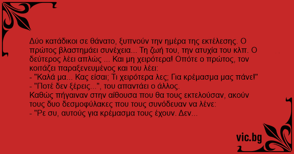 Δύο κατάδικοι σε θάνατο, ξυπνούν την ημέρα της εκτέλεσης. Ο πρώτος βλαστημάει συνέχεια... Τη ζωή του, την ατυχία του κλπ. Ο δεύτερος λέει απλώς ... Και μη χειρότερα! Οπότε ο πρώτος, τον κοιτάζει παραξενευμένος και του λέει: