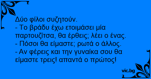 - Aν φέρεις και την γυναίκα σου θα είμαστε τρεις! απαντά ο πρώτος!