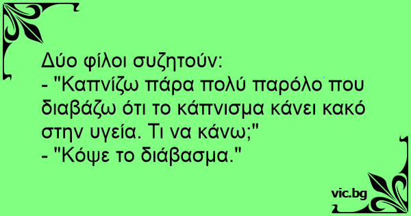 - "Καπνίζω πάρα πολύ παρόλο που διαβάζω ότι το κάπνισμα κάνει κακό στην υγεία. Τι να κάνω;"