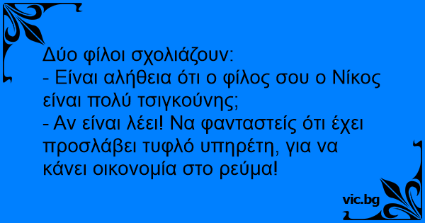 - Αν είναι λέει! Να φανταστείς ότι έχει προσλάβει τυφλό υπηρέτη, για να κάνει οικονομία στο ρεύμα!