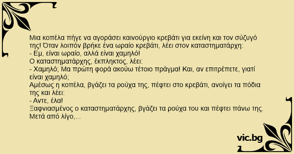 Μια κοπέλα πήγε να αγοράσει καινούργιο κρεβάτι για εκείνη και τον σύζυγό της! Όταν λοιπόν βρήκε ένα ωραίο κρεβάτι, λέει στον καταστηματάρχη: