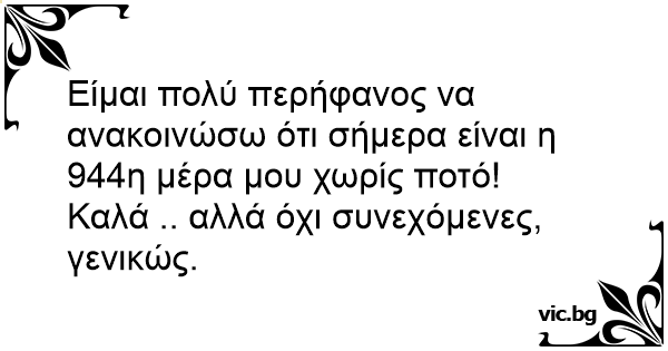 Είμαι πολύ περήφανος να ανακοινώσω ότι σήμερα είναι η 944η μέρα μου χωρίς ποτό! Καλά .. αλλά όχι συνεχόμενες, γενικώς.