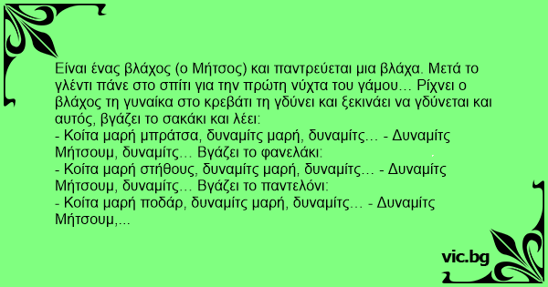 - Κοίτα μαρή ποδάρ, δυναμίτς μαρή, δυναμίτς… - Δυναμίτς Μήτσουμ, δυναμίτς… Βγάζει και το εσώρουχο, πέφτουν στο κρεβάτι, κάνουν ότι είναι να κάνουν και γυρίζει και του λέει η βλάχα: