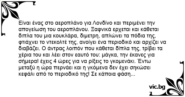 Είναι ένας στο αεροπλάνο για Λονδίνο και περιμένει την απογείωση του αεροπλάνου. Ξαφνικά ερχεται και κάθεται διπλα του μια κουκλάρα, διμετρη, απλώνει τα πόδια της, φτιάχνει το ντεκολτέ της, ανοίγει ένα περιοδικό και αρχίζει να διαβάζει. Ο άντρας λοιπόν που κάθεται δίπλα της, τρίβει τα χέρια του και λέει στον εαυτό του: μάγκα, την έκανες για σήμερα! έχεις 4 ώρες για να ρίξεις το γκομενάκι. Έντω μεταξύ η ώρα περνάει και η γκόμενα δεν έχει σηκώσει κεφάλι από το περιοδικό της! Σε κάποια φάση ακούγεται η ανακοίνωση από τον πιλότο ό,τι το αεροπλάνο σε λίγα λεπτά προσγειώνεται. Ο άντρας έχει αρχίσει και χάνει την υπομονή του, έτσι, γυρνάει και της λέει: συγγνώμη για την ενόχληση, αλλά είστε αφοσιωμένη τόση ώρα στο περιοδικό σας. Πειράζει να μάθω τι διαβάζετε με τόση προσήλωση? Και απαντά η γυναίκα: Διαβάζω ένα άρθρο για τα πέη. Διαβάζω δηλαδή ότι οι μαύροι τον έχουν μακρύ, ενώ οι κρητικοί χοντρό. και πετάγεται ο άντρας και λέει: Συγγνώμη, μα μιλάμε τόση ώρα και δεν έχουμε συστηθεί ακόμα. Αμπτουλάχ Σιφακάκης!