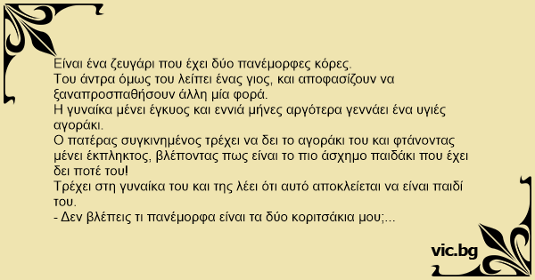 - Δεν βλέπεις τι πανέμορφα είναι τα δύο κοριτσάκια μου; Δεν μπορεί αυτό το παιδί να είναι δικό μου! Μήπως με απάτησες;