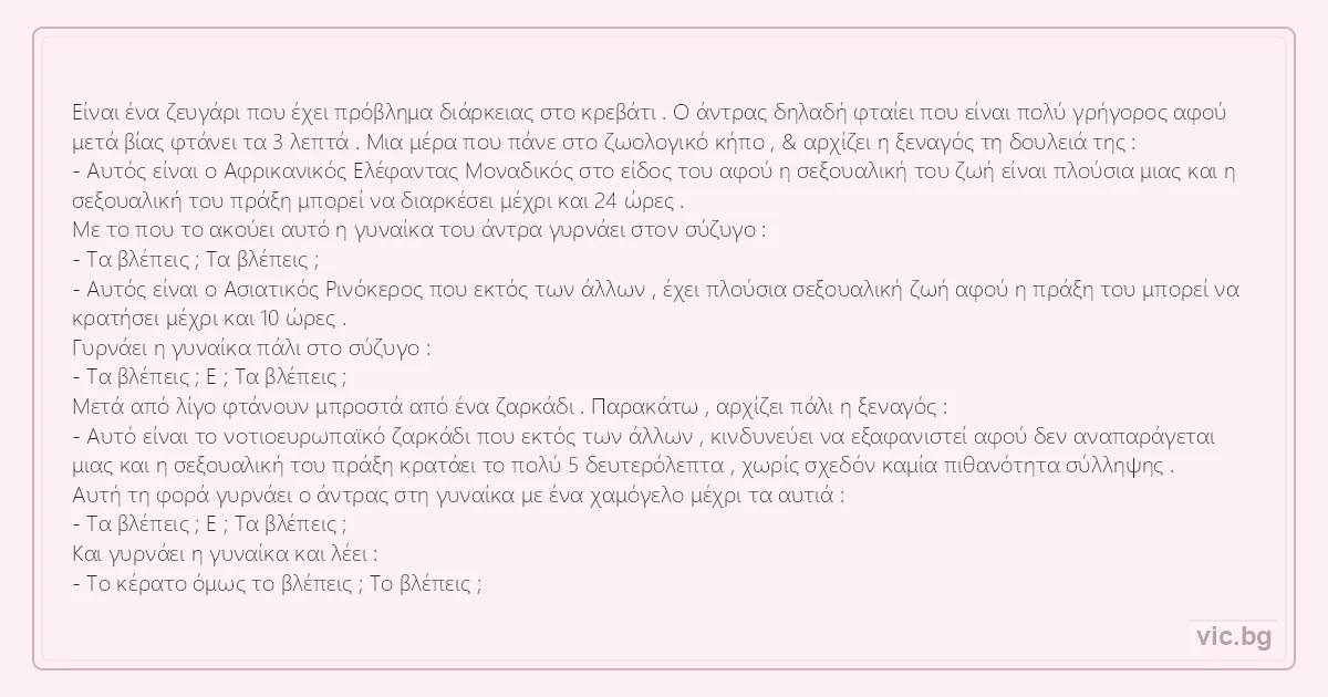 Είναι ένα ζευγάρι που έχει πρόβλημα διάρκειας στο κρεβάτι . Ο άντρας δηλαδή φταίει που είναι πολύ γρήγορος αφού μετά βίας φτάνει τα 3 λεπτά . Μια μέρα που πάνε στο ζωολογικό κήπο , & αρχίζει η ξεναγός τη δουλειά της : - Αυτός είναι ο Αφρικανικός Ελέφαντας Μοναδικός στο είδος του αφού η σεξουαλική του ζωή είναι πλούσια μιας και η σεξουαλική του πράξη μπορεί να διαρκέσει μέχρι και 24 ώρες . Με το που το ακούει αυτό η γυναίκα του άντρα γυρνάει στον σύζυγο : - Τα βλέπεις ; Τα βλέπεις ; - Αυτός είναι ο Ασιατικός Ρινόκερος που εκτός των άλλων , έχει πλούσια σεξουαλική ζωή αφού η πράξη του μπορεί να κρατήσει μέχρι και 10 ώρες . Γυρνάει η γυναίκα πάλι στο σύζυγο : - Τα βλέπεις ; Ε ; Τα βλέπεις ; Μετά από λίγο φτάνουν μπροστά από ένα ζαρκάδι . Παρακάτω , αρχίζει πάλι η ξεναγός : - Αυτό είναι το νοτιοευρωπαϊκό ζαρκάδι που εκτός των άλλων , κινδυνεύει να εξαφανιστεί αφού δεν αναπαράγεται μιας και η σεξουαλική του πράξη κρατάει το πολύ 5 δευτερόλεπτα , χωρίς σχεδόν καμία πιθανότητα σύλληψης . Αυτή τη φορά γυρνάει ο άντρας στη γυναίκα με ένα χαμόγελο μέχρι τα αυτιά : - Τα βλέπεις ; Ε ; Τα βλέπεις ; Και γυρνάει η γυναίκα και λέει : - Το κέρατο όμως το βλέπεις ; Το βλέπεις ;
