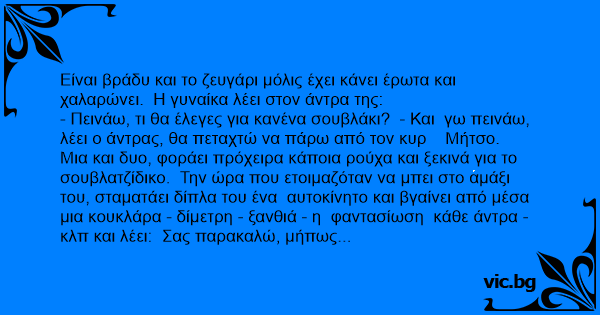 - Πεινάω, τι θα έλεγες για κανένα σουβλάκι? - Και γω πεινάω, λέει ο άντρας, θα πεταχτώ να πάρω από τον κυρ Μήτσο. Μια και δυο, φοράει πρόχειρα κάποια ρούχα και ξεκινά για το σουβλατζίδικο. Την ώρα που ετοιμαζόταν να μπει στο αμάξι του, σταματάει δίπλα του ένα αυτοκίνητο και βγαίνει από μέσα μια κουκλάρα - δίμετρη - ξανθιά - η φαντασίωση κάθε άντρα - κλπ και λέει: Σας παρακαλώ, μήπως ξέρετε πως θα πάω στην οδό ΤΑΔΕ 15? Κόκαλο ο τύπος της ψελλίζει: