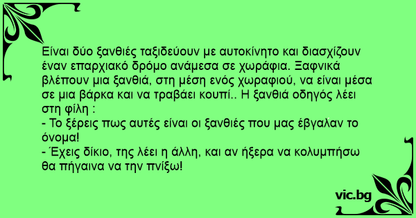 Είναι δύο ξανθιές ταξιδεύουν με αυτοκίνητο και διασχίζουν έναν επαρχιακό δρόμο ανάμεσα σε χωράφια. Ξαφνικά βλέπουν μια ξανθιά, στη μέση ενός χωραφιού, να είναι μέσα σε μια βάρκα και να τραβάει κουπί.. Η ξανθιά οδηγός λέει στη φίλη :