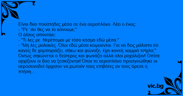 Όντως σηκώνεται ο δεύτερος και φωνάζει αλλά όλοι ροχάλιζαν! Οπότε αρχίζουν οι δυο να ξεσκίζονται! Όταν το αεροπλάνο προσγειώθηκε οι αεροσυνοδοί άρχισαν να ρωτούν τους επιβάτες αν τους άρεσε η πτήση. Όλοι απαντούσαν ότι ήταν θαυμάσιο το ταξίδι κλπ. Βγαίνει και ένας άλλος και απαντάει: