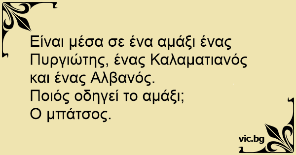Είναι μέσα σε ένα αμάξι ένας Πυργιώτης, ένας Καλαματιανός και ένας Αλβανός.