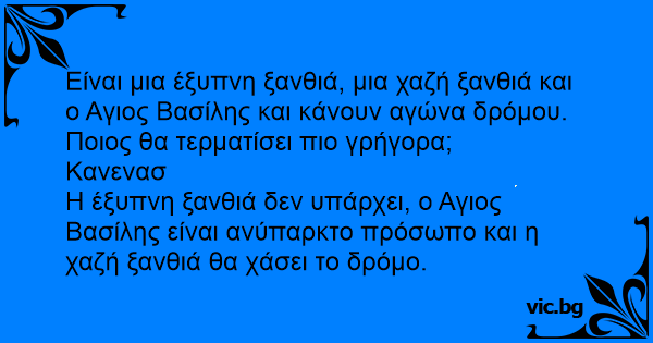 Είναι πάνω σε μια στέγη, ο Αγιος Βασίλης, μια έξυπνη ξανθιά και μια χαζή ξανθιά. Ποιος θα πέσει πρώτος; Η χαζή ξανθιά, γιατί τα άλλα δύο, είναι ανύπαρκτα πρόσωπα!