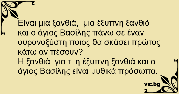 Είναι πάνω σε μια στέγη, ο Αγιος Βασίλης, μια έξυπνη ξανθιά και μια χαζή ξανθιά. Ποιος θα πέσει πρώτος; Η χαζή ξανθιά, γιατί τα άλλα δύο, είναι ανύπαρκτα πρόσωπα!