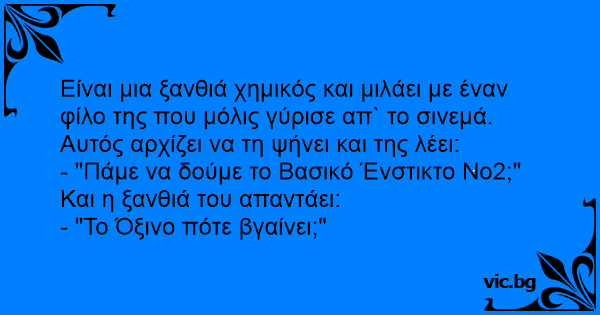 Είναι μια ξανθιά χημικός και μιλάει με έναν φίλο της που μόλις γύρισε απ` το σινεμά. Αυτός αρχίζει να τη ψήνει και της λέει: