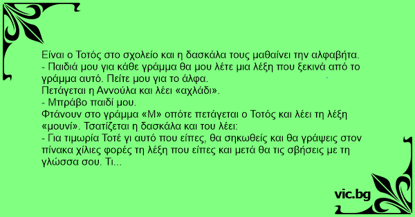 Φτάνουν στο γράμμα «Μ» οπότε πετάγεται ο Τοτός και λέει τη λέξη «μουνί». Τσατίζεται η δασκάλα και του λέει: