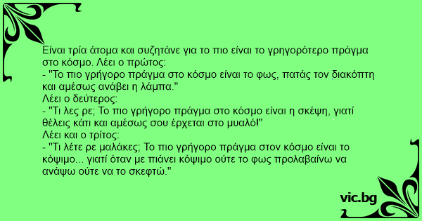 Είναι τρία άτομα και συζητάνε για το πιο είναι το γρηγορότερο πράγμα στο κόσμο. Λέει ο πρώτος: