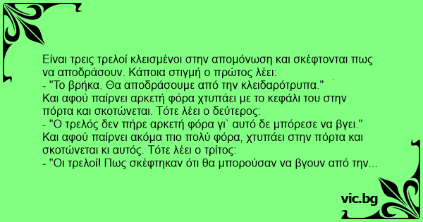Και αφού παίρνει αρκετή φόρα χτυπάει με το κεφάλι του στην πόρτα και σκοτώνεται. Τότε λέει ο δεύτερος:
